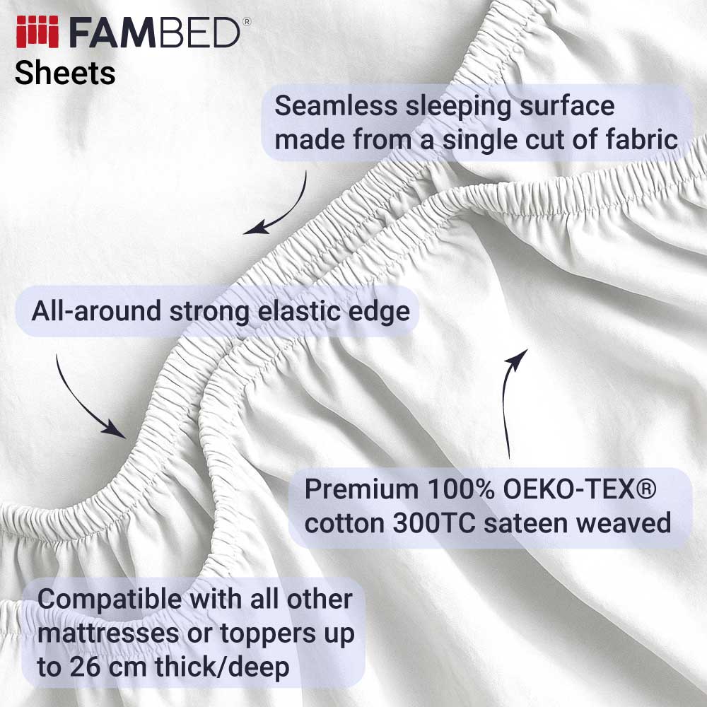 As the sheet comes into direct contact with your family’s bare skin, we’ve chosen premium 100% OEKO-TEX® certified cotton – a natural textile certified free from harmful chemicals. The fitted design wraps the topper mattress in one smooth, seamless layer, with strong elastic to keep it securely in place all night while making it easy and fast to change. The high-quality 300 TC sateen weave makes it durable enough for the daily wear and tear of a busy family bed.